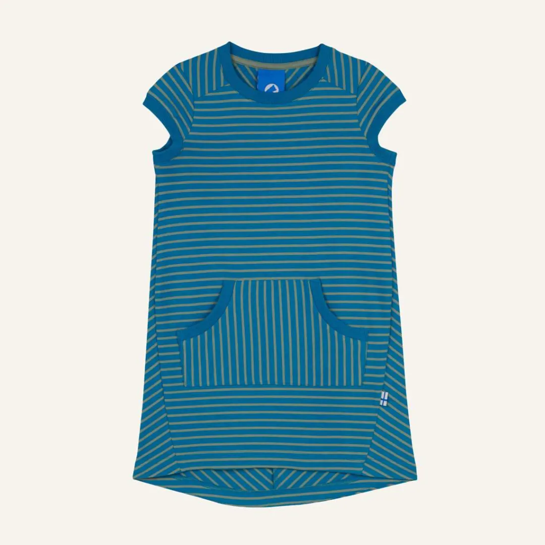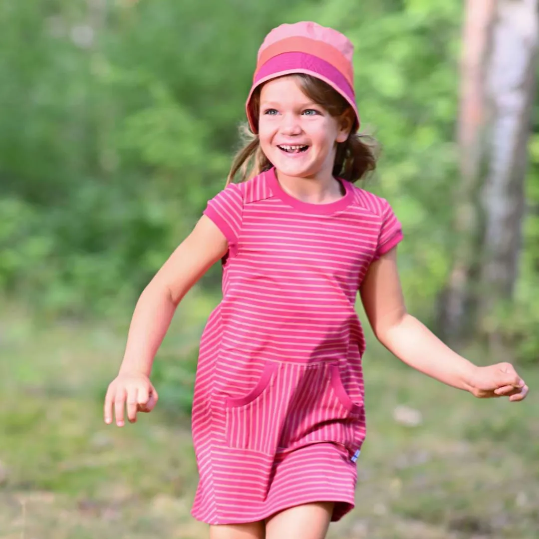 Kein Sommer ohne Kurzarmkleid. KEIDAS überzeugt schon optisch durch Biobaumwolle und seinen fröhlichen Streifenmix. Kinderhände oder Strandfundstücke finden in den beiden Einstecktaschen auf der Vorderseite Platz.