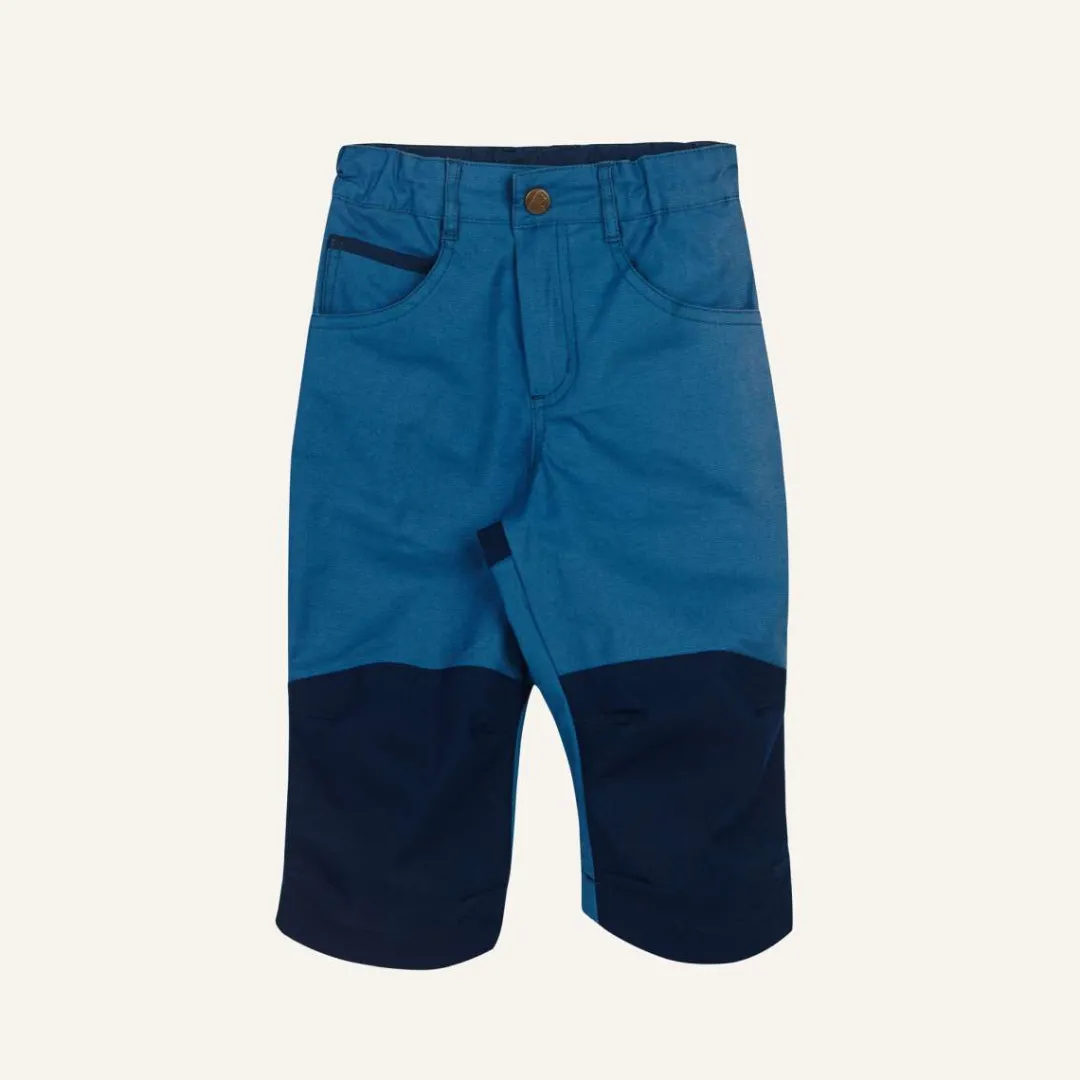 Ich packe meinen Koffer und nehme mit: Die verstärkte 5-Pocket Bermuda KULTA. Mit dieser robusten, knielangen Hose kommt das Kind durch jedes Sommerabenteuer. Die Verstärkungen im Kniebereich machen KULTA zum Dauerbrenner im Kinderkleiderschrank.