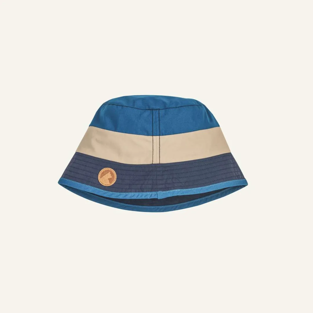 Drei Blockstreifen in drei frischen Farben, dazu die markant abgesteppten Nähte im unteren Drittel: Der Fischerhut ist ein Sommer-Klassiker, der passt, sitzt und schützt – allzeit bereit für jedwede Unternehmungslust.