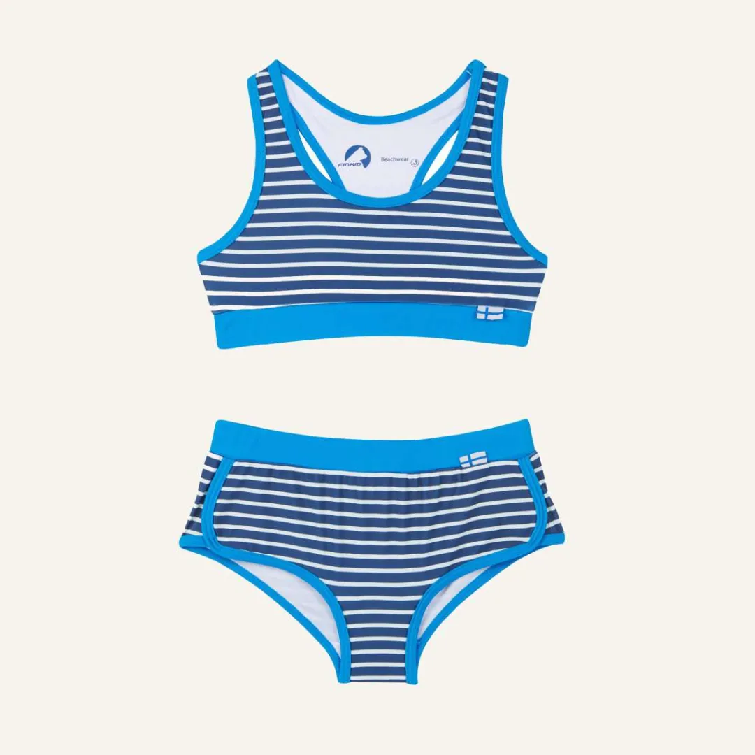 Am Strand ist einfach alles besser. Oder im Schwimmbad. Oder am See. Und mit dem LUOTO Bikini Set stimmt dabei auch das Outfit. Das zweiteilige Set aus Oberteil und Pants gibt es in zwei verschiedenen Ringelmustern, das Material ist schnelltrocknend und mit Lichtschutzfaktor 50+ versehen. Perfekt für lange Sommertage am Wasser.