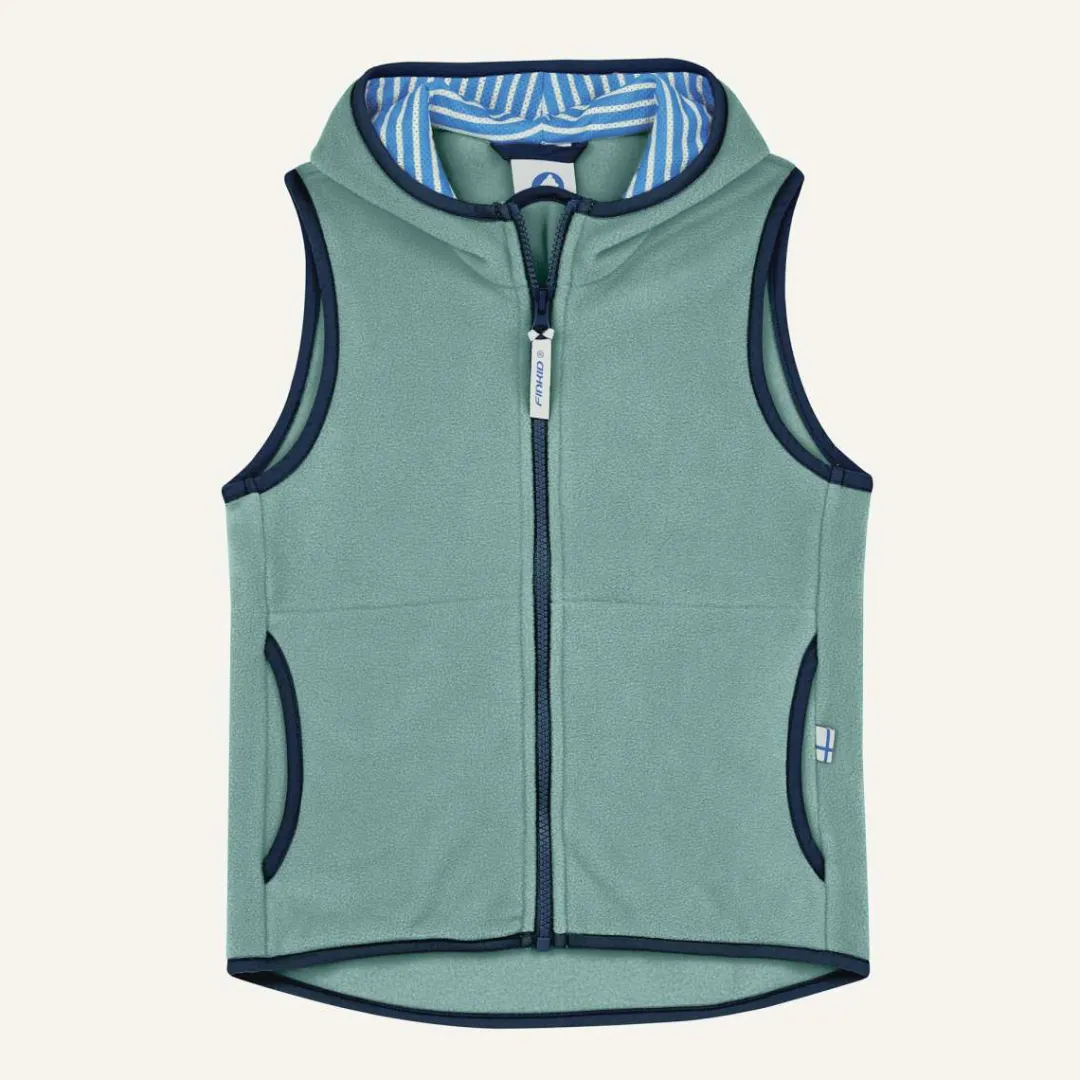 Himmelblau-weiß gestreift wie das Innenfutter der Kapuze – die Weite von Himmel und Strand sind immer mit dabei, wenn POPPELI ausgeführt wird. Unsere Fleeceweste mit der finkid Zwergenkapuzewärmt den Rumpf und lässt den Armen alle Freiheit – zum Buddeln, Muschelsuchen und Keschern. Meshfutter. Auch als Zip In Innenjacke kombinierbar.