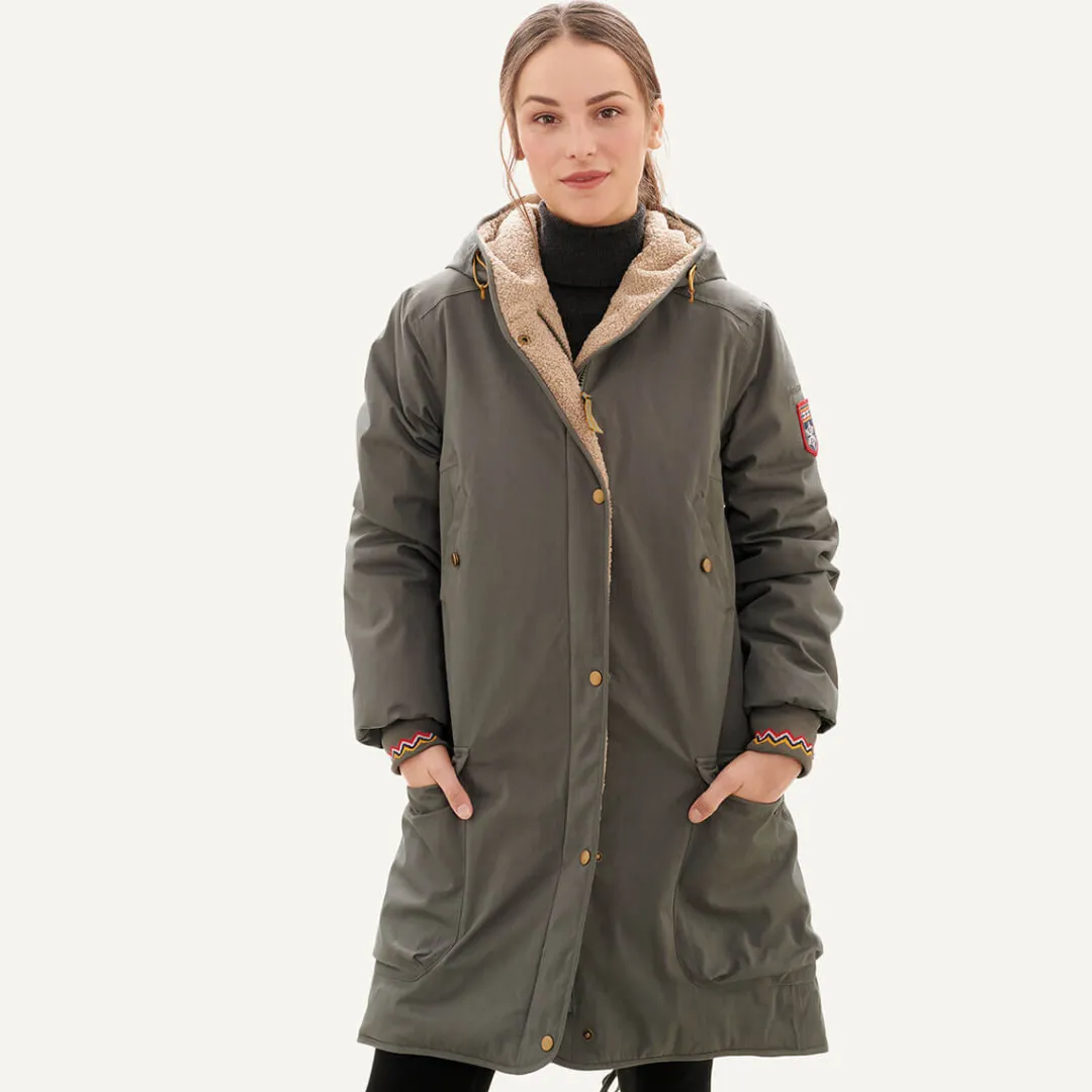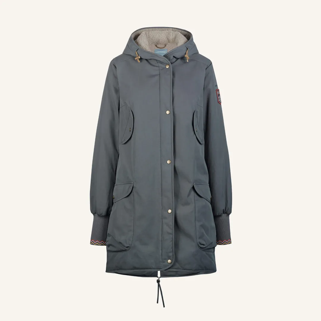 IVALUKKA ist ein Winterparka für Frauen aus wasserabweisendem Baumwollgewebe für einen natürlichen Look und einem Kuschelfutter aus weichem Shepherd-Teddyfleece – ideal für kühle Herbst- und Wintertage. Der lässige Schnitt, Brusttaschen, eine geschwungene Saumlinie und geräumige Kapuze sorgen für einen angenehmen Sitz und femininen Look. Lange Rippbündchen mit dezentem Folksy-Muster an den Ärmeln bieten zusätzlichen Schutz vor Wind und Kälte. Erhältlich in den Größen 34 bis 44. Von finside.
