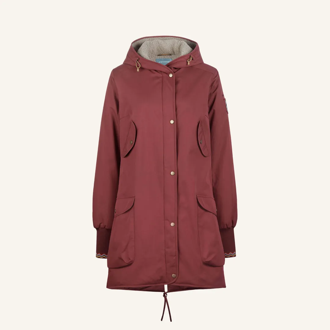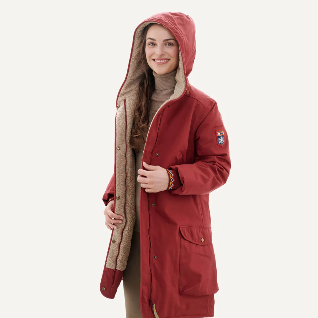 IVALUKKA ist ein Winterparka für Frauen aus wasserabweisendem Baumwollgewebe für einen natürlichen Look und einem Kuschelfutter aus weichem Shepherd-Teddyfleece – ideal für kühle Herbst- und Wintertage. Der lässige Schnitt, Brusttaschen, eine geschwungene Saumlinie und geräumige Kapuze sorgen für einen angenehmen Sitz und femininen Look. Lange Rippbündchen mit dezentem Folksy-Muster an den Ärmeln bieten zusätzlichen Schutz vor Wind und Kälte. Erhältlich in den Größen 34 bis 44. Von finside.