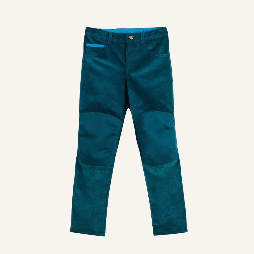 Schmale Five Pocket Kordhose mit unifarbenen, ovalen Kniebesätzen. Die Knieabnäher formen das Bein vor und unterstützen so die Bewegungsfreiheit. Im hinteren Bund sorgt ein Gummizug für Halt, die Hose ist aber auch mit Gürtel tragbar. Der krempelbare Saum ermöglicht eine individuelle Anpassung der Hosenlänge. Saumaufschlag sowie rechte Tasche und rückwärtiger Bund sind kontrastierend eingefasst.