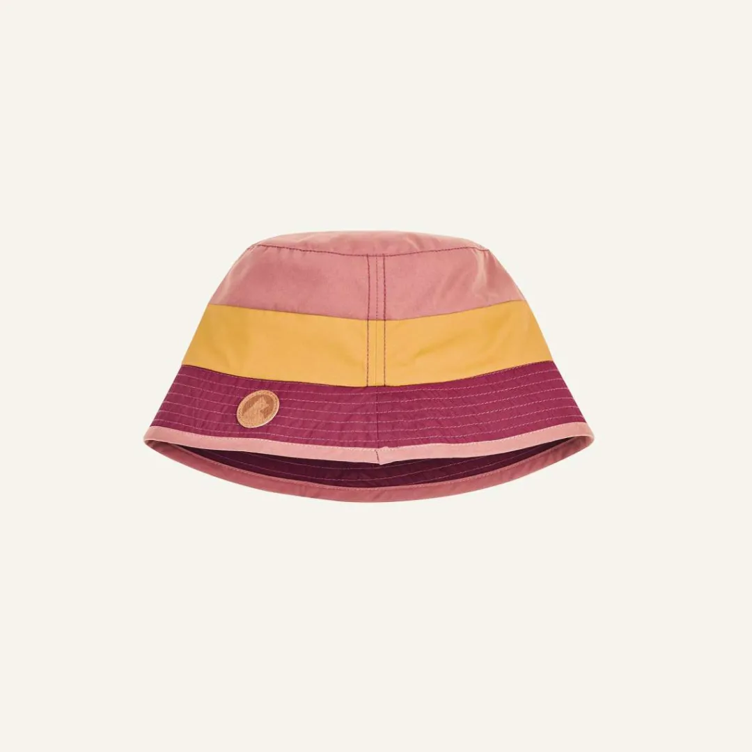 Drei Blockstreifen in drei frischen Farben, dazu die markant abgesteppten Nähte im unteren Drittel: Der Fischerhut ist ein Sommer-Klassiker, der passt, sitzt und schützt – allzeit bereit für jedwede Unternehmungslust.