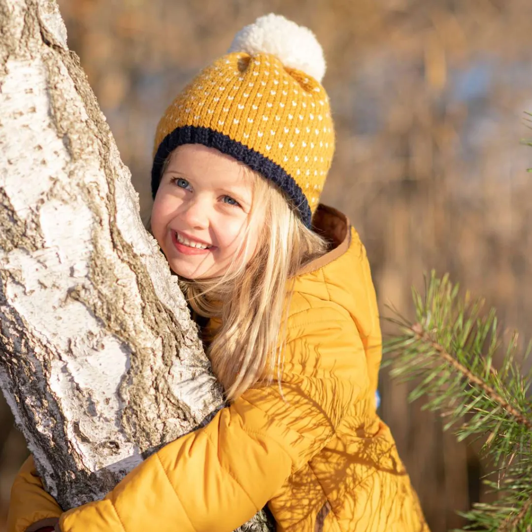 Komme, was wolle. Mit diesem Grobstrickbeanie mit Pünktchen und Bommel bleiben Kinderköpfe in jeder Situation angenehm warm. Der Oberstoff besteht aus 51 % Wolle, und trotzt Wind und Wetter wirkt das eingenähte Innenfutter zusätzlich wärmeisolierend. Der perfekte Begleiter durch die Wintermonate.