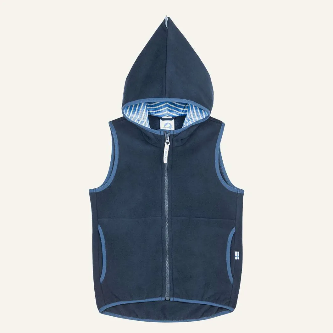 Himmelblau-weiß gestreift wie das Innenfutter der Kapuze – die Weite von Himmel und Strand sind immer mit dabei, wenn POPPELI ausgeführt wird. Unsere Fleeceweste mit der finkid Zwergenkapuzewärmt den Rumpf und lässt den Armen alle Freiheit – zum Buddeln, Muschelsuchen und Keschern. Meshfutter. Auch als Zip In Innenjacke kombinierbar.