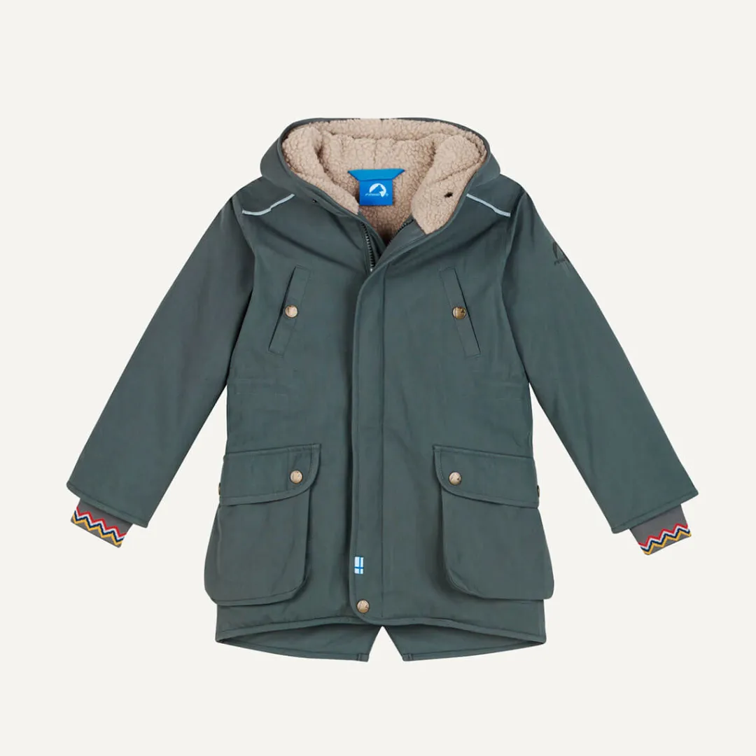 Der finkid® Winterparka TUULIKKI für Kinder vereint funktionale Outdoorqualität mit finnischem Folksy-Charme. Das hochwertige Baumwollmischgewebe im natürlichen Look, kombiniert mit kuscheligem Teddyfutter, macht diesen Kinderparka zum idealen Begleiter an kalten Wintertagen. Dank wasserdichtem Material, versiegelten Nähten und einer atmungsaktiven Membran bleibt dein Kind bei Schnee und Regen zuverlässig trocken. Das PFC-freie Finish schützt zusätzlich vor Schmutz und Nässe. Reflektierende Details erhöhen die Sichtbarkeit, sodass auch beim Spielen im Winterwunderland Sicherheit garantiert ist. Der Parka lässt sich an der Taille verstellen und passt sich perfekt an. Ab Größe 120/130 überzeugt TUULIKKI zudem mit runder Konturkapuze für einen modernen Look. Von finkid®
