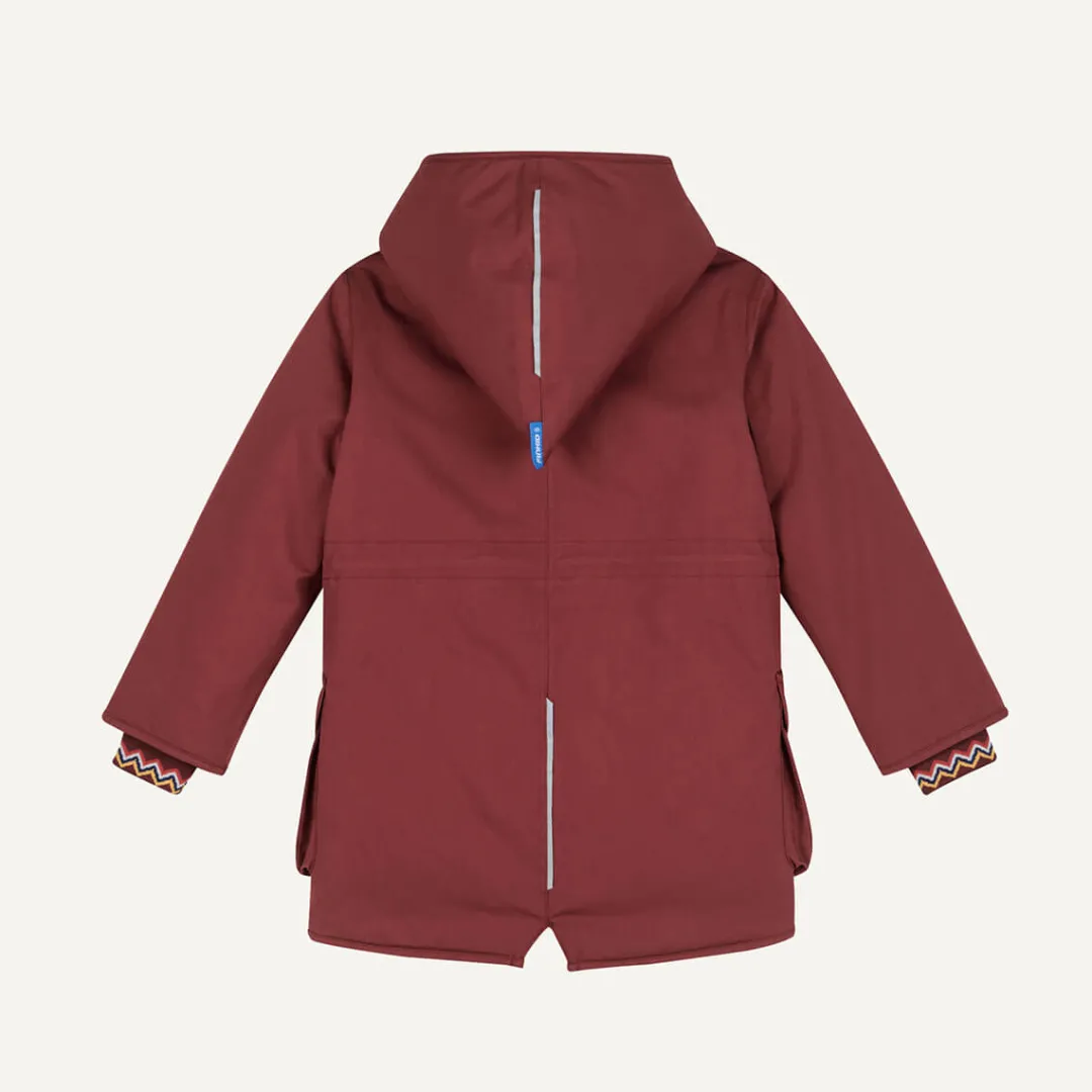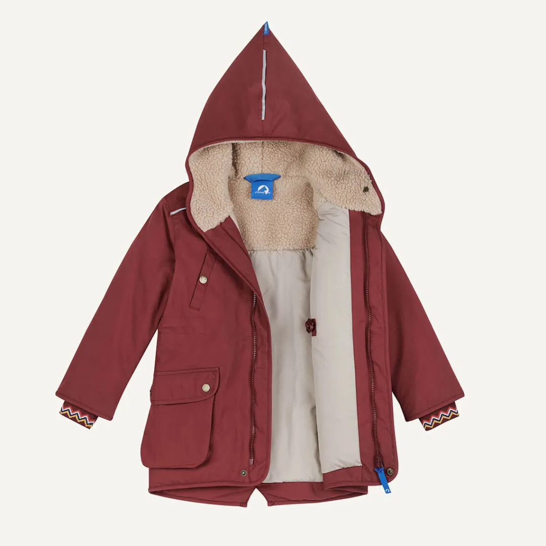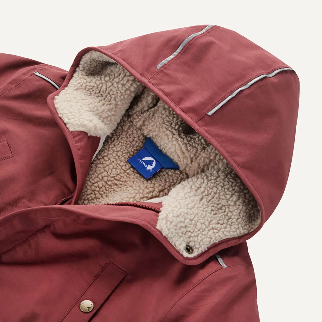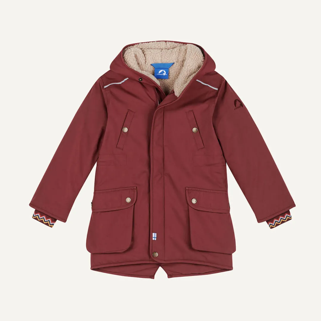 Der finkid® Winterparka TUULIKKI für Kinder vereint funktionale Outdoorqualität mit finnischem Folksy-Charme. Das hochwertige Baumwollmischgewebe im natürlichen Look, kombiniert mit kuscheligem Teddyfutter, macht diesen Kinderparka zum idealen Begleiter an kalten Wintertagen. Dank wasserdichtem Material, versiegelten Nähten und einer atmungsaktiven Membran bleibt dein Kind bei Schnee und Regen zuverlässig trocken. Das PFC-freie Finish schützt zusätzlich vor Schmutz und Nässe. Reflektierende Details erhöhen die Sichtbarkeit, sodass auch beim Spielen im Winterwunderland Sicherheit garantiert ist. Der Parka lässt sich an der Taille verstellen und passt sich perfekt an. Ab Größe 120/130 überzeugt TUULIKKI zudem mit runder Konturkapuze für einen modernen Look. Von finkid®